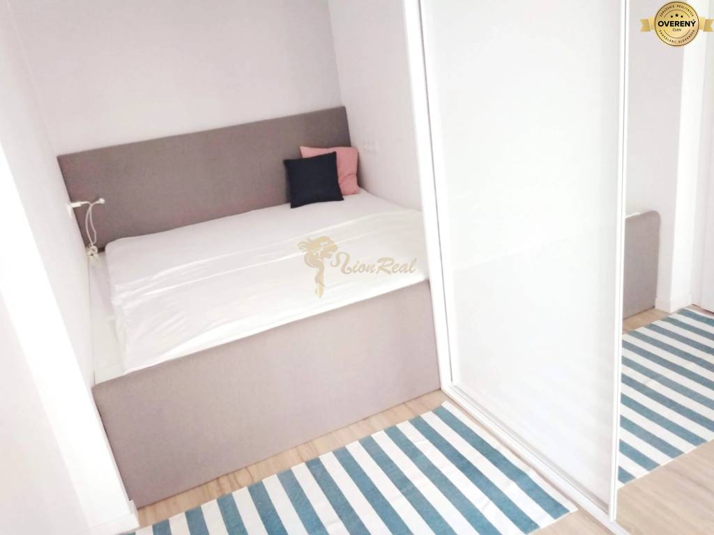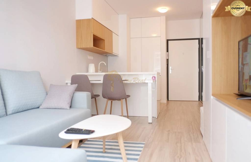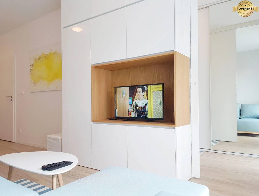 Byt sa predáva kompletne zariadený nábytkom vrátane spotrebičov - vstavané úložné priestory v chodbe, obývačke a v spálni, kuchynská linka, chladnička s mrazničkou, umývačka riadu, varná doska, elektrická rúra, práčka, jedálenské sedenie, stoličky, sedačka, konferenčný stolík, posteľ.