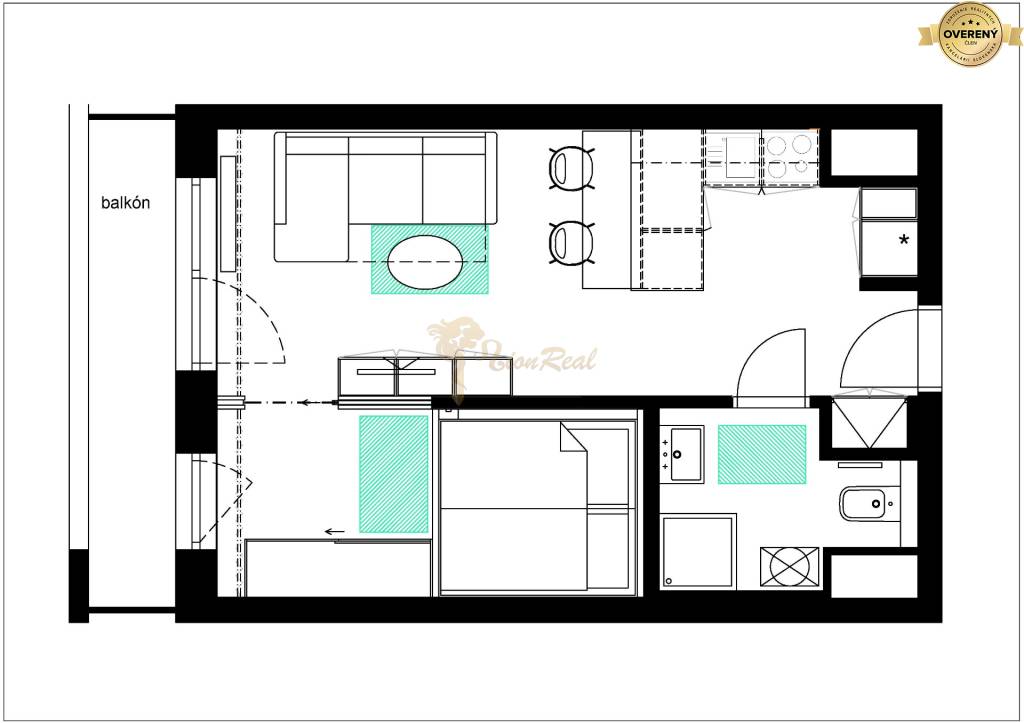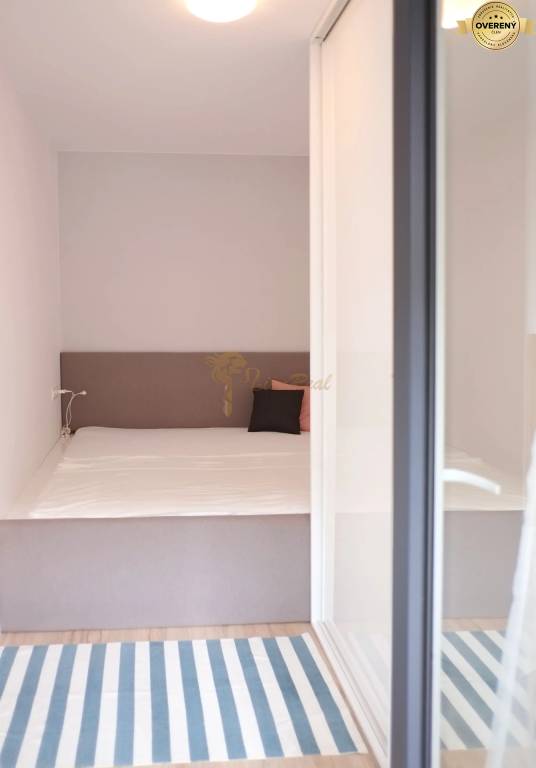 Dispozícia: vstupný priestor, kuchyňa, kúpeľňa, obývačka, spálňa (oddelená od obývacej izby posuvnými dverami), balkón
