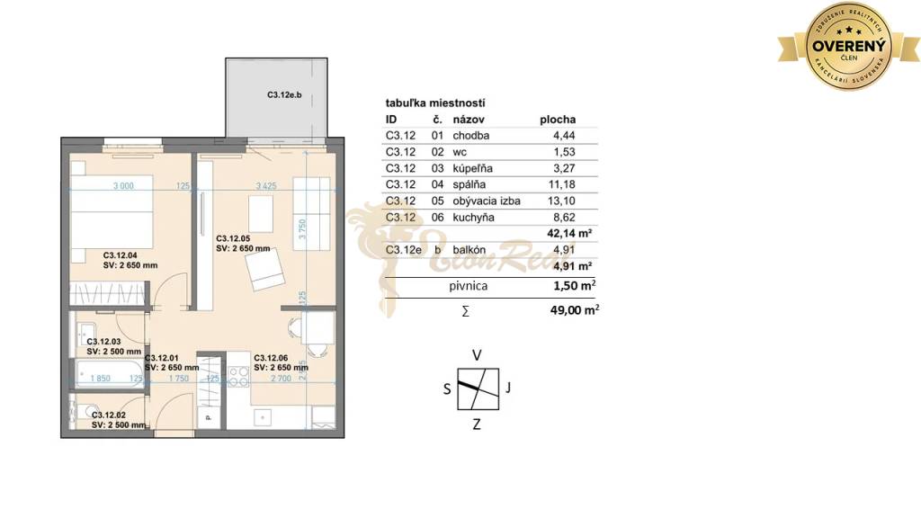 Byt sa nachádza na 3. poschodí/ 5, výťah, výmera bytu 42.14 m² a balkónom 4.91 m2.