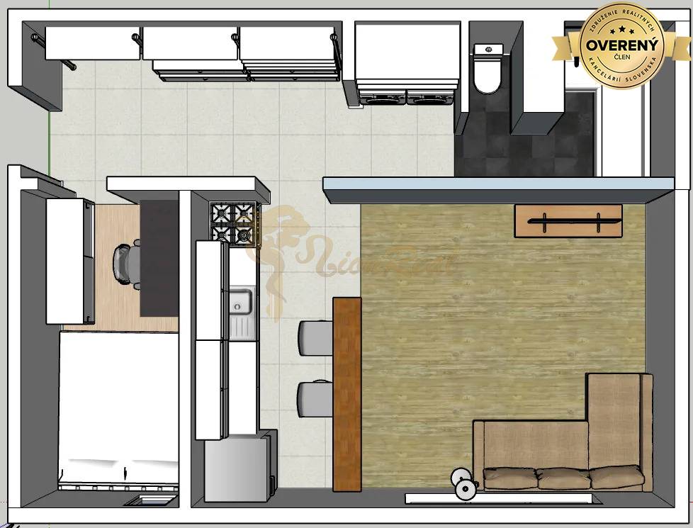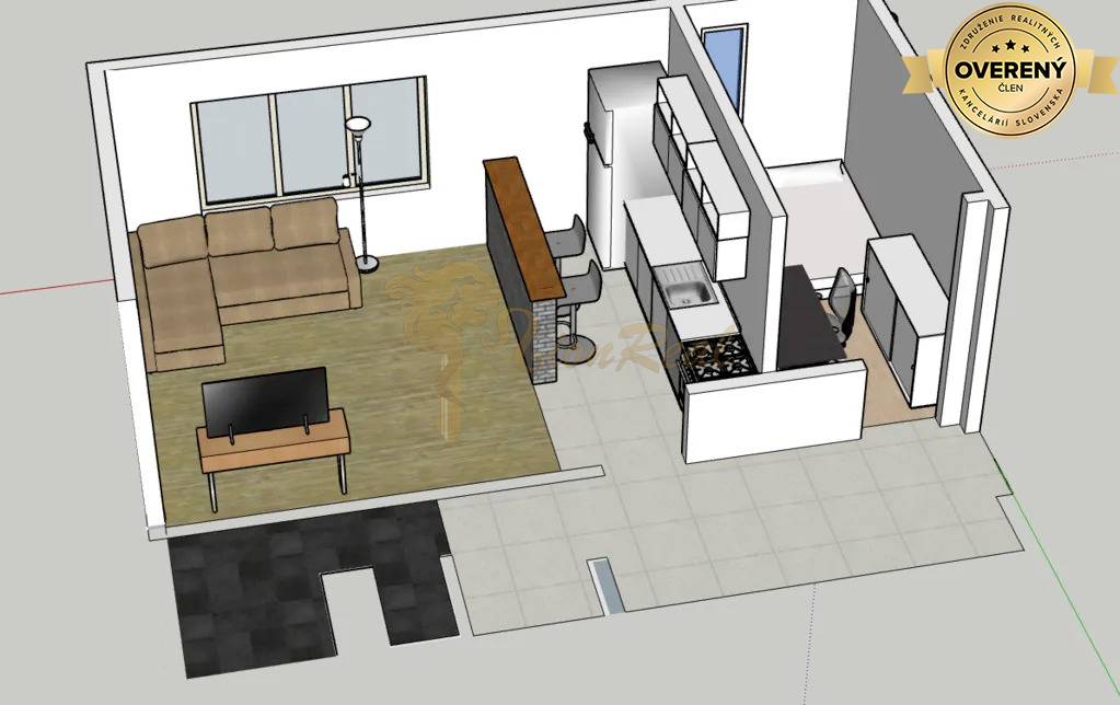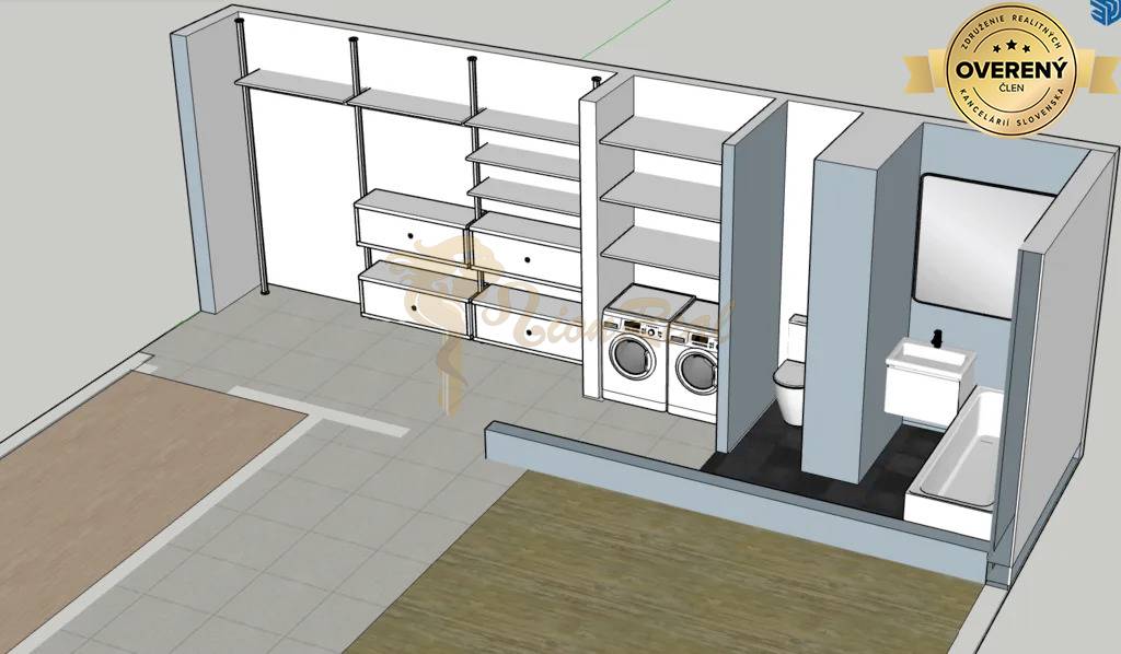 Byt je dispozične veľmi dobre riešený – pozostáva z priestrannej vstupnej chodby, samostatnej izby a ďalšej izby spojenej s kuchyňou (oddelenej barovým pultom) a z modernej kúpeľne s WC po kompletnej rekonštrukcii. Veľká kuchynská linka je vybavená umývačkou, no frost chladničkou a plynovým sporákom s elektrickou rúrou. Barový pult ktorý oddeľuje obývaciu izbu od kuchyne je obložený sekaným kameňom a poskytuje pohodlné sedenie pre 3-4 osoby. V priestrannej chodbe sa nachádza montovaný modulárny IKEA systém pozostávajúci zo závesných, policových a zásuvkových dielov, ktoré poskytujú nadštandard úložného priestoru pre min. 4 osoby. V pôvodnom priestore vstavanej skrine sa nachádza policový systém na mieru - s práčkou a sušičkou. Oproti je namontovaná aj hrazda na cvičenie, ktorá v prípade potreby zároveň slúži ako praktický vešiak na prádlo.