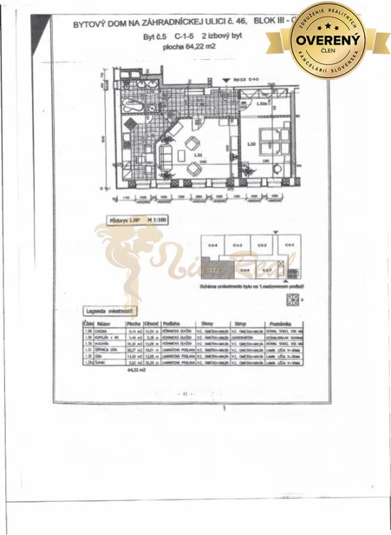 Výmera 64 m2, nachádza sa na prízemí 4-poschodového tehlového bytového domu. Pivnica v suteréne.