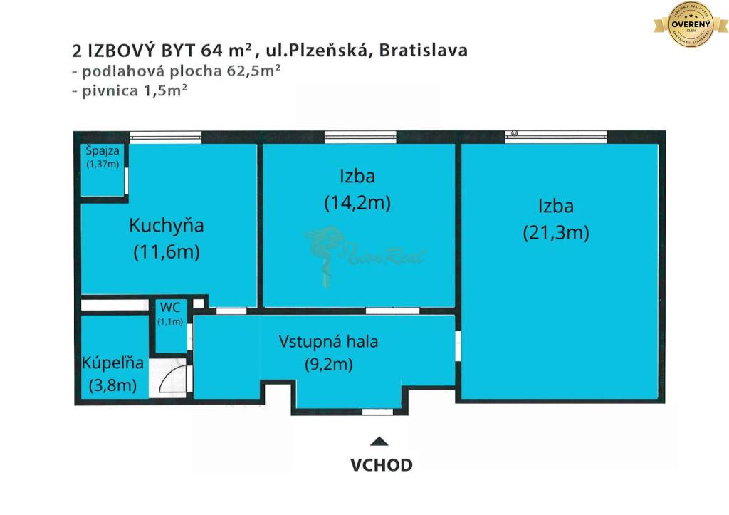 Podlahová plocha bytu je 62,5 m² a pivničná kobka (1,5 m²), nachádza sa na 5.p./7 zatepleného panelového domu s výťahom.
