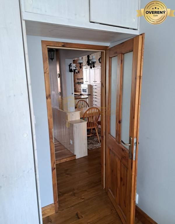 Podlaha v celom byte je z drevenej dlážkovice. na strope v obývacej časti sú drevené trámy v rovnakom dekore ako podlaha. Interiérové dvere sú rovnako drevené v rovnakom dekore.
