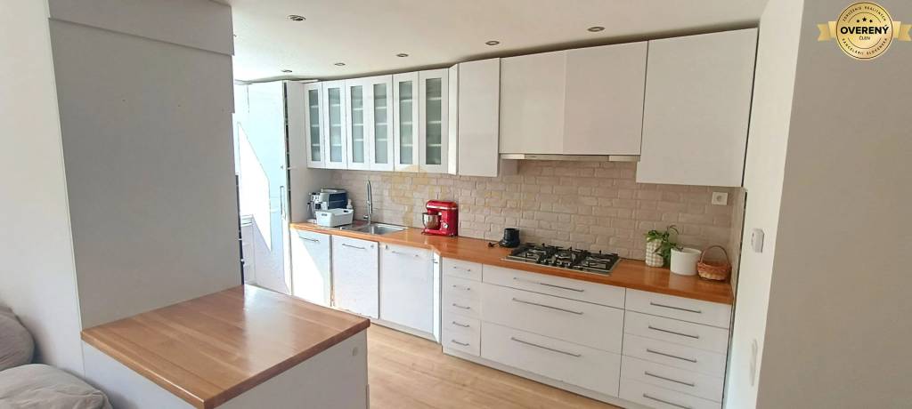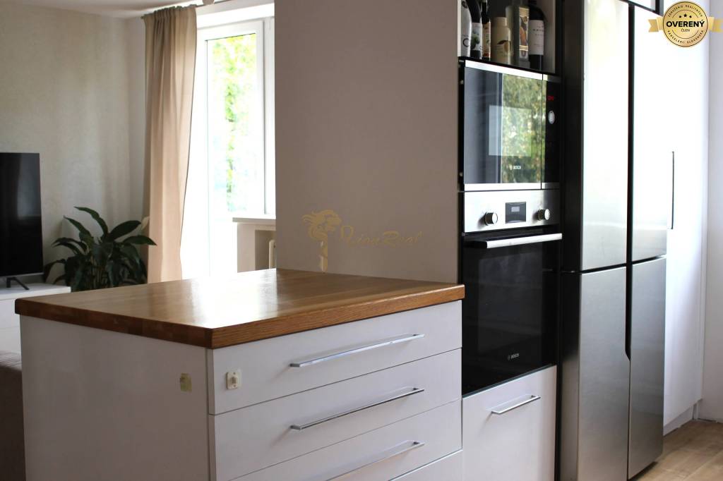 kuchynská linka vyhotovená z masívu dreva vybavená Bosch spotrebičmi (rúra, varná doska, umývačka riadu, digestor, mikrovlnná rúra) + tichá práčka Whirlpool