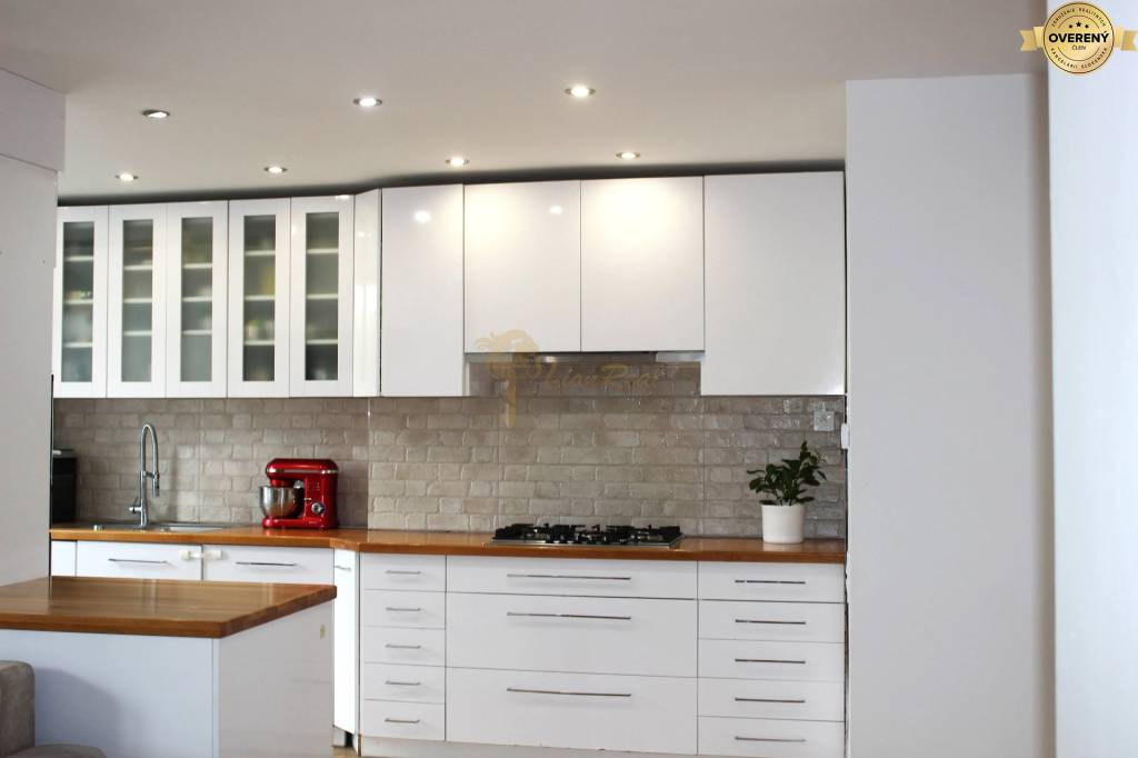 dizajnový interiér v štýle biela + drevo, kvalitné podlahy, rolldoor skrine na mieru