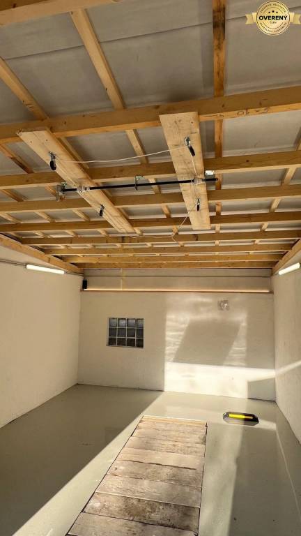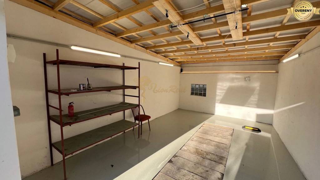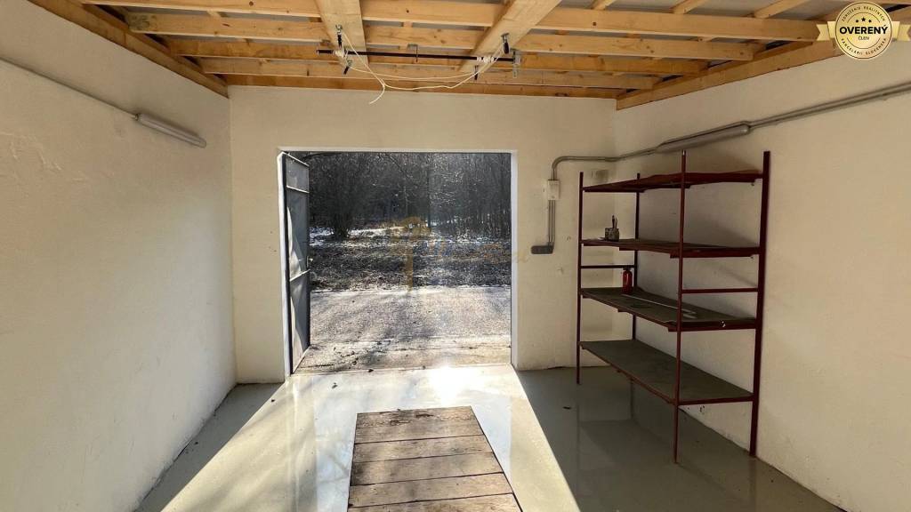 Garáž je po rekonštrukcii strechy, ktorá bola zhotovená nanovo, nová liata podlaha, montážna jama, garáž je vymaľovaná s novou elektroinštaláciou a osvetlením. Súčasťou je policová zostava, ktorá zostava v garáži. Brána je kovová. Na strope zariadenie pre zdvihnutie truhly Thule MultiLift.